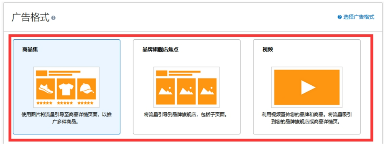 在亚马逊后台创建 CPC 广告活动时,有商品推广、品牌推广、展示型推广这三种广告类型(如下图)。大量广告数据表明,这三种广告方式转化率递减,商品推广型 CPC 广告整体转化率最高,展示型推广最低。