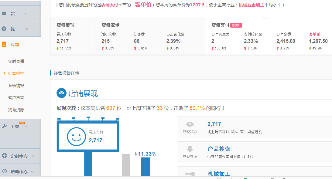 专题内包含实时直播、经营报告、竞争情报、客户声音、我有货源。