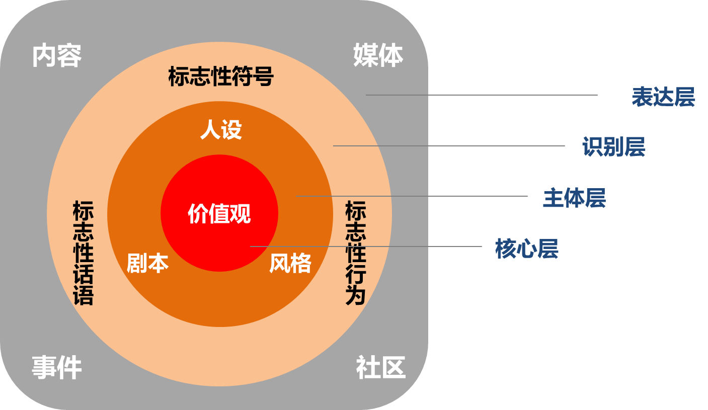 最核心的一层是价值观,是品牌灵魂塑造的原点和品牌人格的统领,就像一个人一样,其精神品格、行为习惯乃至言谈举止本质上都会受到自身“三观”的影响,因此价值观是品牌IP的基本内核。