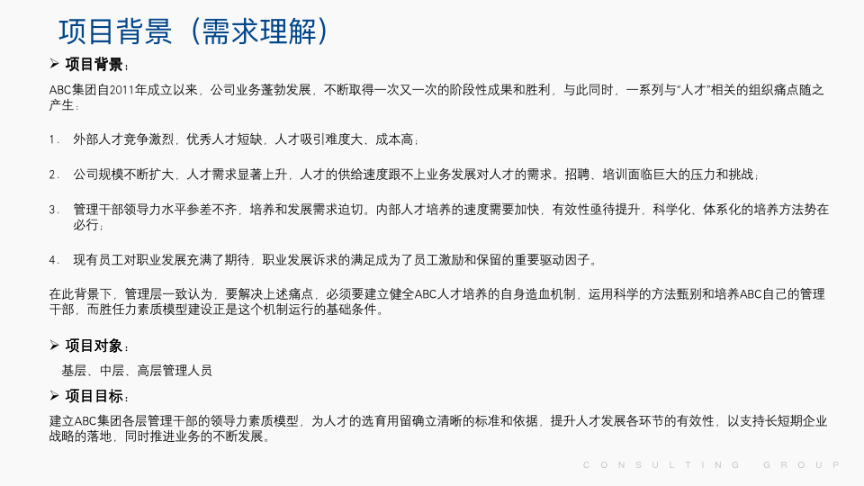 ABC公司当时人员规模3000人左右,基层中层高层管理人员人数500人左右,我们的项目目标是建立ABC公司基层、中层、高层三个管理层级的管理干部能力模型,也就是领导力素质模型,为接下来三个层级管理干部的选育用留确立人才标准。值得一提的是,ABC公司将本咨询项目列为当年度的四大战略重点之一。由此可见,ABC公司对管理干部人才标准建立的迫切及对此次胜任力建模项目的重视。