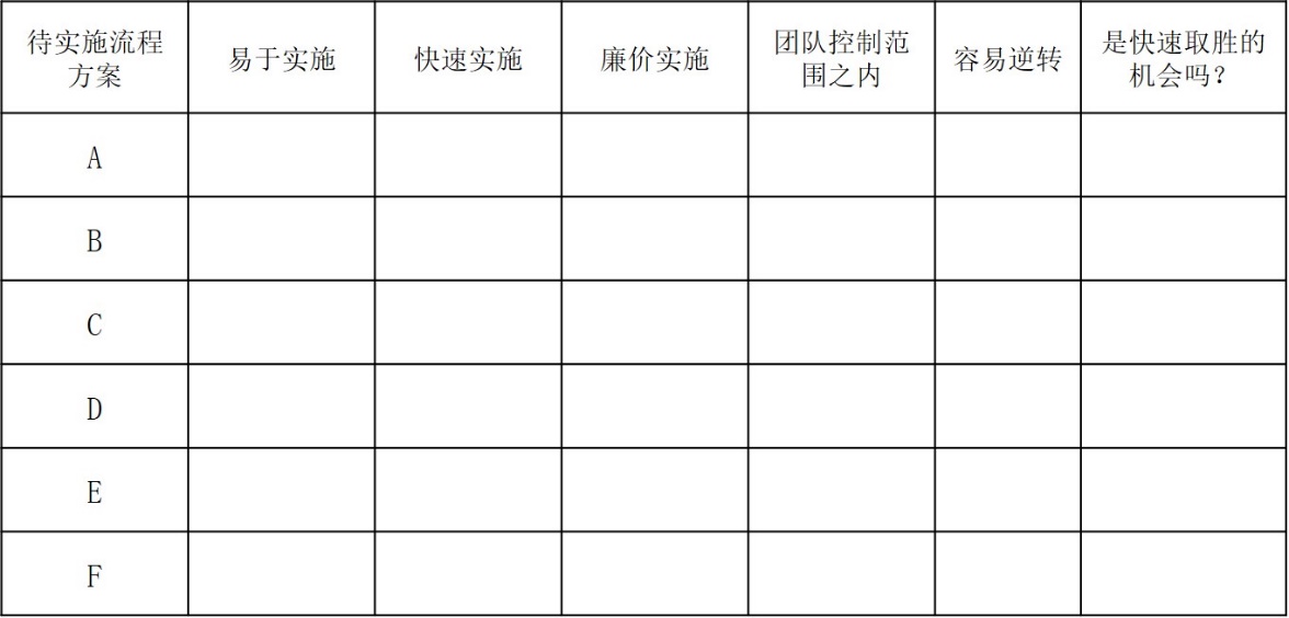 快赢主要从五个维度进行评估,包括:是否易于实施、是否快速实施、是否廉价实施、是否在团队控制范围之内和是否容易逆转。只有都符合要求了,才是真正可以实现快赢的方案。这个在选择优化模块的时候就要提前预判好,不能选择了又中途放弃,会打击士气。约翰P.科特提到的“积累短期胜利”,也大抵如此。