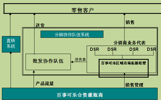 分销协作模式,即企业的区域经理与经销商的业务员相结合的模式。图9-2是百事可乐的分销协作模式。