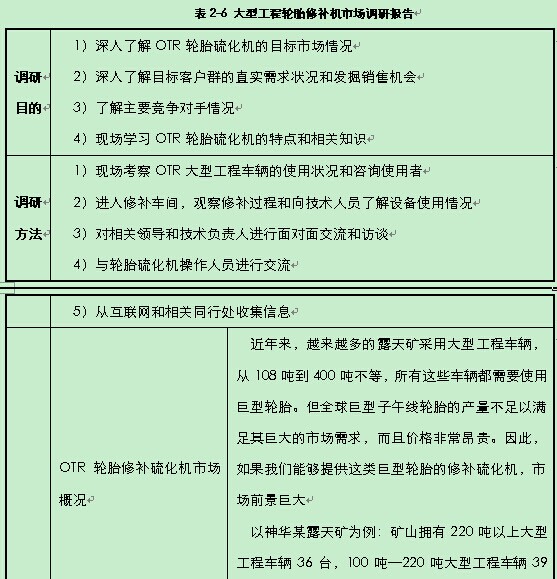 A公司总部在美国,于2012年下半年收购了一家意大利的大型工程轮胎修补机生产企业。2013年初,总部向全球多个分公司提出了在当地开拓大型工程轮胎修补机业务的要求,中国分公司市场部被授权对目标市场进行调研,初次现场考察后完成的报告如表2-6所示。