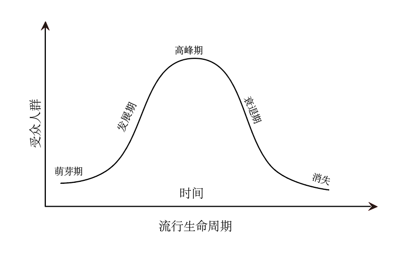 流行时尚,是指在一定的时期内,在全球范围内,在不同层次、阶层的人口中广泛传播起来的服装服饰。时尚流行具有一定的生命周期,一般会经历萌芽期、发展期、高峰期、衰退期几个阶段。如图2-1所示。