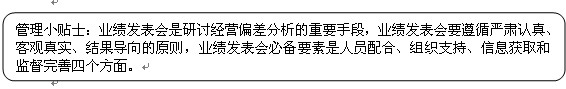 (4)监督完善。企业在筹备业绩发表会时,应当建立专门的委员会来对整个业绩发表会负责。委员会向各经营单元和部门员工提供必要的咨询服务,帮助其顺利准备会议所需各项材料。此外,委员会还应当对业绩发表会的过程和结果进行监督和修正,及时完善业绩发表会的各项制度和实施过程,修补会议中存在的漏洞,帮助企业完善业绩发表会体系,并针对其建立符合企业经营管理状况要求的分析和报告系统,保证信息的沟通顺畅,意见能够得到及时的反馈。
