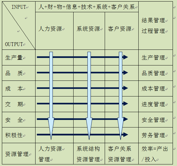 企业的经营管理活动是一项复杂的系统工程,图4-3是一张管理活动结构图。在经营管理活动中主要涉及两方面的管理:一方面是资源(即投入)的管理;另一方面是过程及产出的管理。