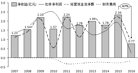 从图中可以看出,智飞生物的净收益从2007年到2009年持续增长,但在2009年之后,就停止了增长。2015年净收益2.34亿元,2016年则跌到了0.77亿元,跌幅高达67%。