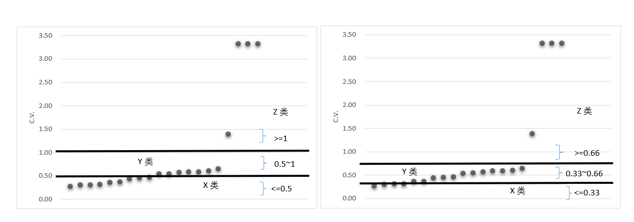 这八字的剑术之道,同样也是适用在XYZ分类上。并非一定要把三个类别的区分点定在0.5和1上。当全部货物变异系数都是在1之下,这个时候就要活用,不必拘泥,尝试把区分点设在0.4和0.8上。通过不断调整,对货物做出适当的特征区分。