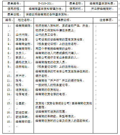 填写《经销商基本资料表》:各营业所增加新的经销商时,组长填写《经销商基本资料表》,若为需要铁路运输的经销商开户,组长还要向所长提交《铁运基本资料表》。填表时请参看《经销商基本资料表》填写说明书。