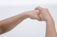 4.右手拇指放于左掌内与右手中指相对的无名指根部地方,不需用力,只要轻轻相互贴合扣住(图 2-6)。
