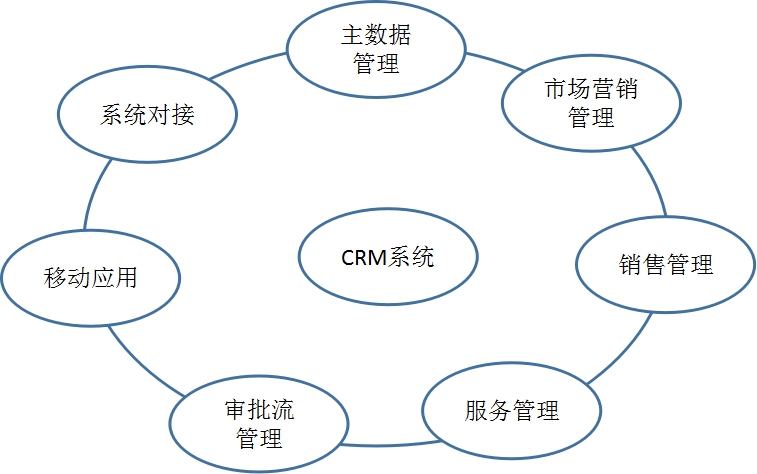 CRM的主要功能模块包括:主数据管理、市场营销管理、销售管理、服务管理、审批流管理、移动应用、系统对接,下面逐一介绍各个功能。如图2-20所示。
