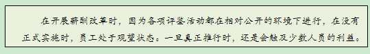 :薪酬改革对员工工资是一种大幅度的调整,说实话,进行这种大幅度的调整我们就一定要慎重,所以我们首先还是局部试行或者演算。在开展薪酬改革时,因为各项评鉴活动都在相对公开的环境下进行,在没有正式实施时,员工处于观望状态。一旦真正推行时,还是会触及少数人员的利益。所以,我们一定要试行,要谨慎地推进薪酬福利改革。
