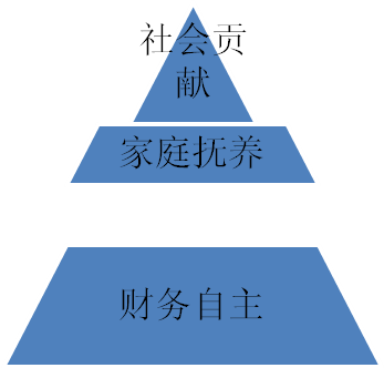 基于这理论和实践,我们的财务需求和目标也像阶梯一样从低到高按层次分为三种,分别是:财务自主、家庭抚养、社会贡献。这三个阶层与财富的积累、保有和分配息息相关。第一层是实现个人的财务自由,维持所设定的生活质量;第二层是为家庭成员,尤其是为下一代保留一定金额的资产;第三层是欲对社会做出的贡献,尽量满足社会的期待,并承担一定的社会责任。这三个层次的优先顺序从下而上。