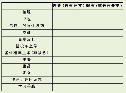尤其是定期讨论有关个人或家庭对购物和消费的“需要(need)”和“想要(want)”的抉择——延迟回报(delay gratification)。表4-24是家长和孩子可以定期一起讨论并分辨的支出:
