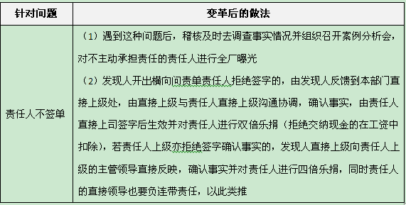 :。如果事实清楚,责任人拒绝签字,发现人可以不停向上级呈报,越往上报责任人的成本越高。