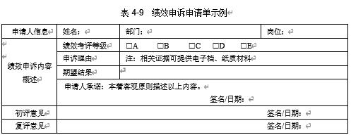 (1)​ 发起绩效申诉。当员工对自己的考评结果有异议的时候,可以发起绩效申诉,并如实填写申请单(线上或纸质),如表 4-9 所示,可以根据实际需要进行 “裁剪”。