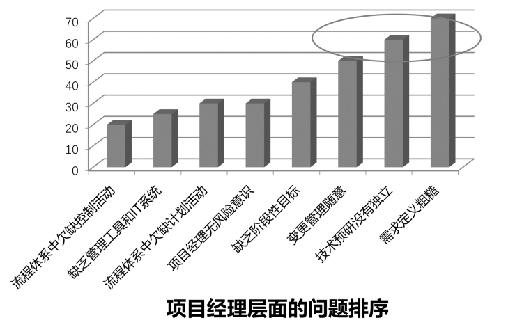 咨询师发现在项目管理层面,“需求分析粗糙”“缺乏前瞻性的技术预研”“需求变更随意”是引起项目延期的最重要的原因;在研发管理这个层面,“缺乏有效的产品规划”“没有预留风险缓冲时间”“缺乏历史数据支撑制定计划”则是最重要的原因。