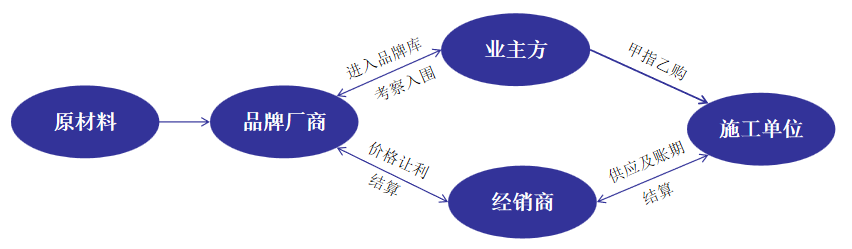 路径①则是甲供材,由业主方制订采购计划并直接采购,品牌厂家与业主方直接结算。
