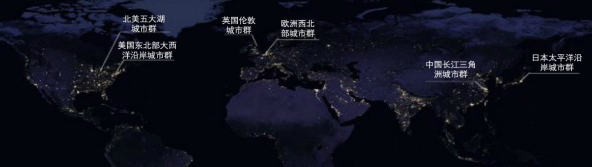 随着技术的进步,“夜灯”数据逐渐成为人们观测城市经济水平和人口聚集的重要工具。根据NASA-NOAA的Suomi国家极地轨道伙伴卫星(NPP)观测到的2016年地球“夜灯”图像,我们可以看到,以伦敦为核心的英国城市群、以纽约为核心的美国东北部大西洋沿岸城市群、以巴黎为核心的欧洲西北部城市群、以东京为核心的日本太平洋沿岸城市群和以芝加哥为核心的北美五大湖城市群夜间灯光亮度最高且已连成片,表明这些区域经济发展水平较高,城市发展成熟。