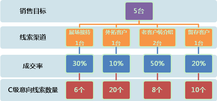 若某销售顾问月度销量目标定为5台,他每个月展场接待新增意向客户成交1台,外拓意向客户成交1台,老客户转介绍成交2台,留存意向客户成交1台。假定他展场接待、外拓客户、老客户转介绍、留存客户的C级及以上(2个月内购车)成交率分别为30%、10%、50%、20%,那么他四种渠道C级意向客户的线索数量分别需要达到6个、20个、8个和10个。据此,这名销售顾问应该很清楚该投入多少天展场接待,多少天行销外拓,该花多少时间用以维系老客户,该如何跟进留存意向客户。对于销售经理来说,很容易让团队就目标达成共识,也很容易为团队制定每周的工作计划。