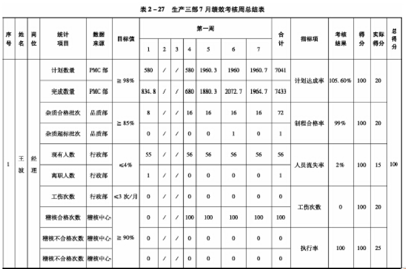 :周绩效考核汇总表只是计算得分情况,也不发钱,但我们会把这一周的考核结果记录下来,告诉你按照绩效考核标准,你这周实际达成了多少,得多少分,你的目标是超过了还是没超过。生产三部7月份绩效考核周总结表如表2-27所示。
