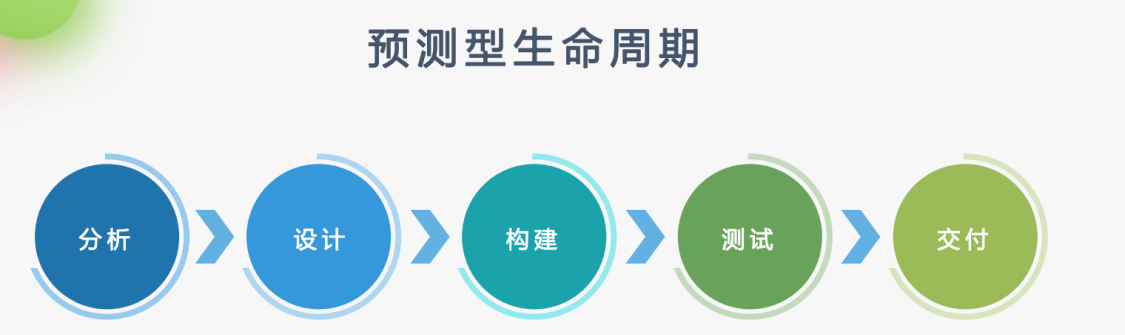 预测型将软件生命周期划分为分析、设计、构建、测试和交付等活动。各项活动自上而下、按照固定的顺序逐项进行,前后相互衔接的若干个阶段形如瀑布流水一样,最终得到软件产品。