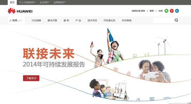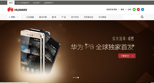 华为网站的策划、设计都很成功,板式大气,一个官网包含三个主网栏目,有个人与家庭用户、企业用户、运营商用户,每个主网下面又包含不同的栏目,内容丰富,但却搜索便捷,链接非常清晰。每个主网页图片的选择都突出了华为的核心价值理念或者产品的核心技术。