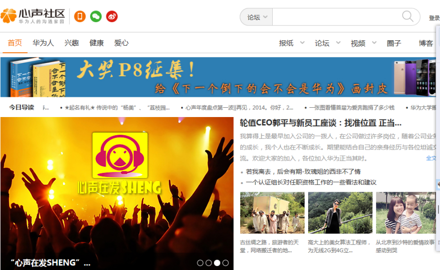 “心声社区”论坛定位为华为人的沟通家园,有98%的在职员工都是注册会员。栏目精彩纷呈,内容涉及面非常广,有论坛、圈子、博客、政策、热点、管理、兴趣等栏目,论坛下又设华为家事、七彩生活、一路同行、行政大家谈等子栏目。同时,还开通了心声微信、华为内刊APP等微媒体,更加方便信息的广泛传播。栏目中的话题杂陈,但都充满着正能量。如“心声社区”正在给《下一个倒下的会不会是华为》征集封面,这实际上是华为向全球员工灌输危机意识的一种方式。危机是华为管理中不断热炒的话题,看到这个页面,让人不由得想起任正非曾经写过的一篇在IT业界流传的文章《华为的冬天》,许多公司的老总都向下属推荐阅读,联想集团总裁杨元庆就是该文的积极推荐者。另一个论坛页面,展现的是员工们丰富多彩的业余生活,娱乐和家庭生活也是工作的一部分,这是新时期的企业文化管理者必须拥有的一种思维方法。