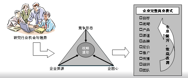 老板既可以通过管理团队、外部研究及顾问的途径,进行机会判断,也可以将自己的感悟变成课题,交由管理团队或外部研究顾问机构去验证。这一阶段企业战略制定需要形成一定的方法论模式,进行快速的、高质量的操作,以推动企业战略决策的形成。