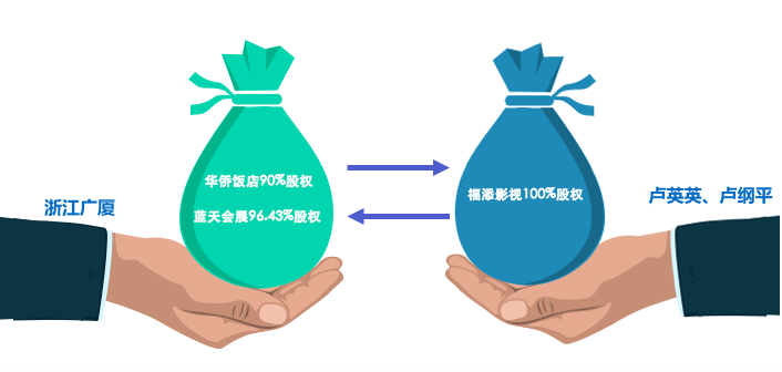 浙江广厦通过资产置换,将公司持有的杭州华侨饭店有限责任公司90%的股权和浙江蓝天白云会展中心有限公司96.43%的股权,与卢英英、卢纲平(二人系浙江广厦控股股东广厦控股董事长楼明先生的妻子与亲属,该交易构成关联交易)持有的东阳福添影视有限公司100%的股权进行置换。在交易完成后,浙江广厦完全控股福添影视,福添影视成为浙江广厦旗下的子公司。