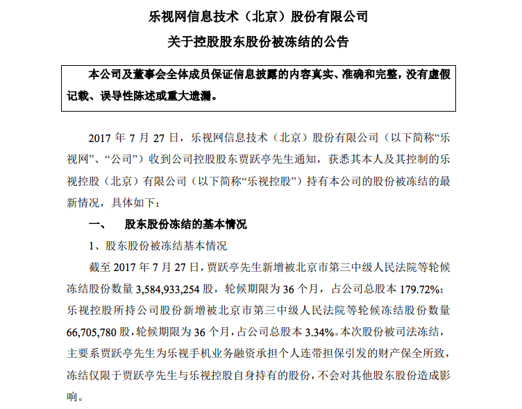 2017年7月4日,乐视网发布公告称收到贾跃亭的通知,获悉其本人及其所控制的乐视控股所持有的公司部分股份被司法冻结,原因系贾跃亭为乐视手机业务融资承担个人连带担保引发的财产保全所致。如图2-4所示。