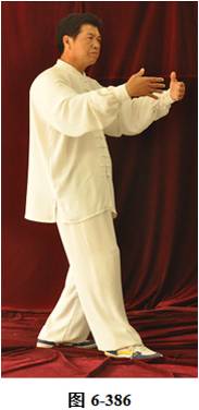 接上式,腰后拱微倚,两手臂随腰向里捋转,左小臂直立,掌心朝向右外,右小臂回收至左臂肘下,呈托肘状,右手心朝下。左脚尖里转向北,腰微右转,重心移向左腿;腰微含,右脚随向东南由脚跟迈出一步。腰微拱,重心移落右腿,随之转腰身体朝向东南, 左脚尖向里转朝向正东。两臂随身体转向东南,顺势向下划弧圆撑, 两掌指相对,掌心朝里,重心移落左腿;腰微拱上提,重心转移至右腿,身体前移,两臂向前掤;腰微含下沉,重心微移,两臂翻转。腰上提右脚向东南垫步,随即右臂上举至超过头顶,手腕旋转掌心向外架于右外额前。身体微前移,重心落于右腿上,呈右弓步。左手掌由胸前旋翻向东南方推出,眼神平视(见图6-383至6-387)。