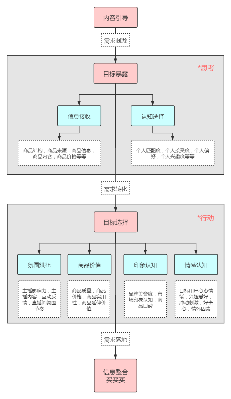 直播电商对比传统电商一个较大的创新突破在于“货找人“!传统电商下消费者通常是“产生需求”——“确认需求”——“寻找商品”——“需求落地”,是一个“人找货”的过程环节。而直播电商,主播通过内容直播,将产品上架到直播间,附上产品的购买入口,此时需求链就演变成“内容引导需求”——“被动产生需求”——“确认需求”——“需求落地”。