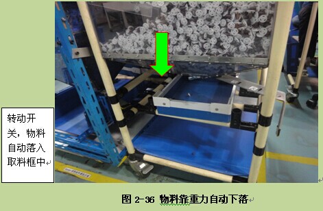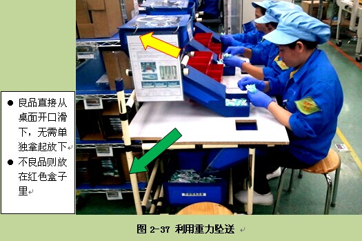 一并说明这两个原则。零件盒底部要设计成倾斜面,使零件能以重力方式自动滑落,喂料到前缘地方,而减少动作距离。如果零件太重不易自动喂料时,也可采用震动送料的方式达到目的。产品做好之后,最好能以重力方式自然落至成品盒处,以减少用手搬运或移动的次数,也可消除疲劳及缩短操作时间,如图2-37所示。