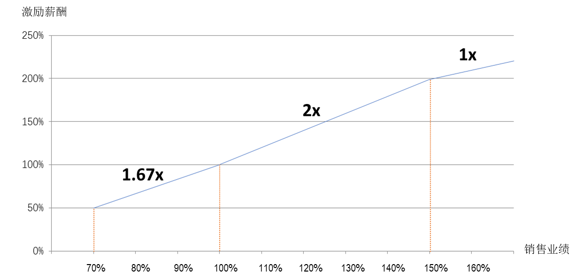 减速器:减速器保持收入持续增长,但在最高绩效水平下的增量收益远低于较低绩效水平。在图9-8的示例中,未达到70%起付点,销售人员没有激励薪酬。起付点到目标之间,使用梯级加速器计算激励薪酬。70%~100%的业绩区间内,销售人员每完成1%业绩,可获得1.67%的激励薪酬。100%~150%优异点的业绩区间内,销售人员每完成1%的业绩,可获得2%的激励薪酬。150%优异点以上的业绩,使用减速器计算激励薪酬。销售人员每完成1%业绩,可获得1%的激励薪酬。减速器使得额外销售的收益得以保持,从而鼓励销售人员继续销售,同时降低企业可能面临的现金流风险。