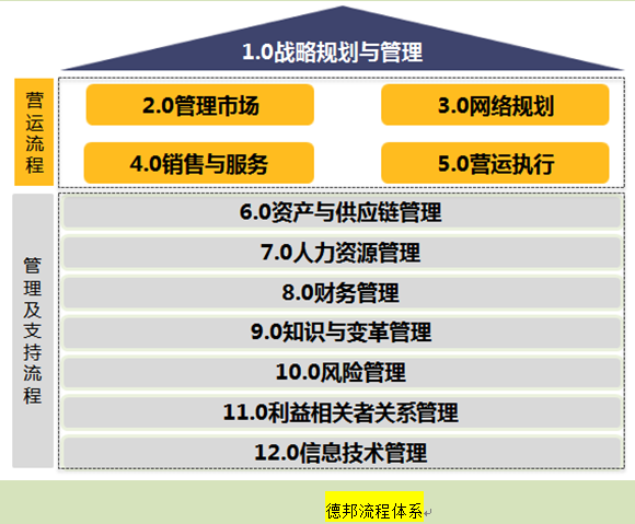 IBM就是从这种整体价值链的逻辑出发,对德邦原有的流程逻辑进行再梳理,将德邦流程体系重新划分为战略规划、管理市场、网络规划、销售与服务和营运执行5个营运流程,和资产与供应链管理、人力资源管理、财务管理、风险管理和知识管理等7个管理与支持流程,总计12个一级流程。