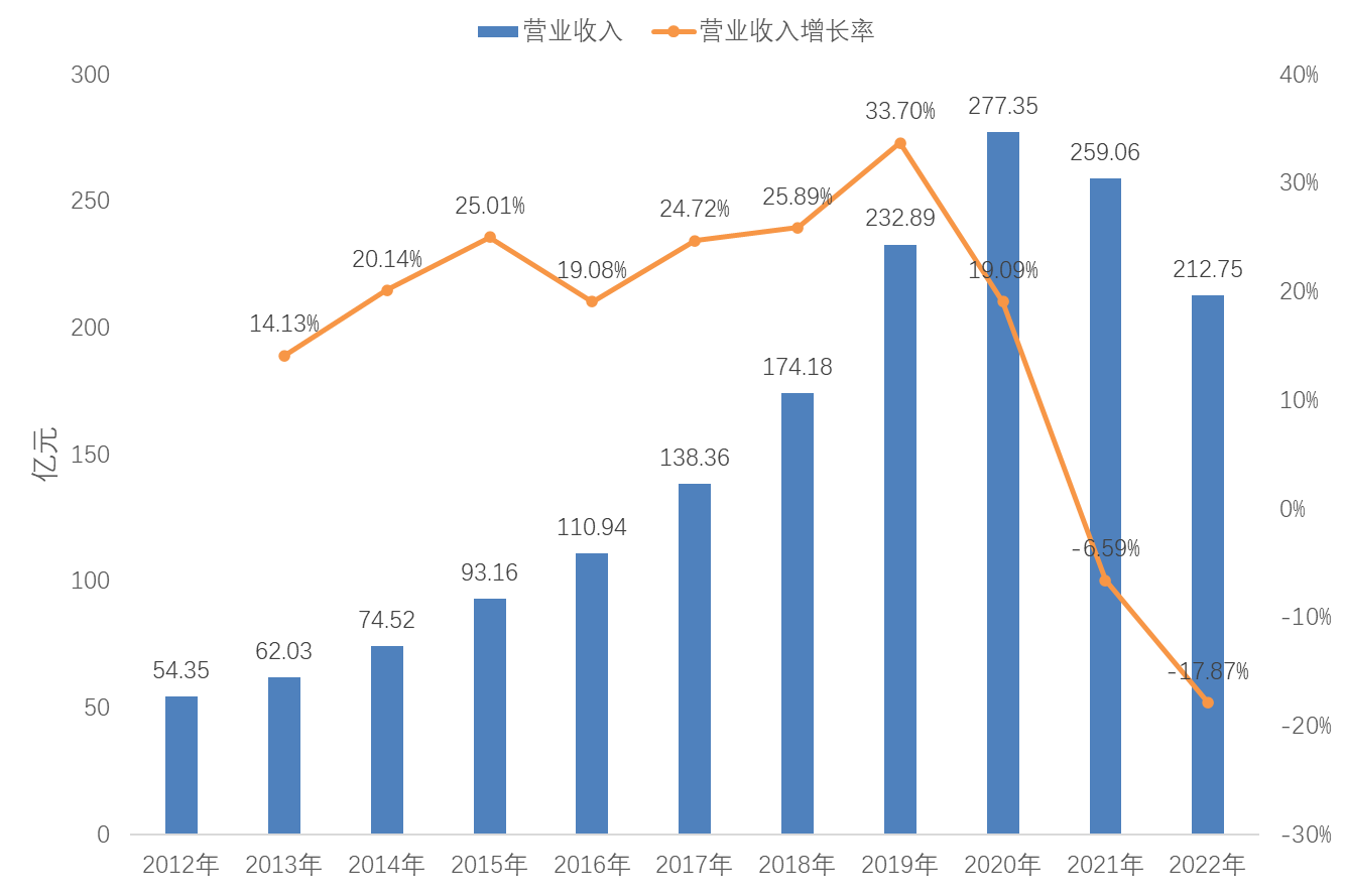 2020年,恒瑞医药营业收入277.35亿元,归母净利润63.28亿元,取得自公司成立以来最佳业绩。2021年该公司实现营业收入259.06亿元,同比下降6.59%;归母净利润45.3亿元,同比下降28.41%。这是恒瑞医药上市20多年来首次出现营业收入和净利润双降的情况。2022年公司营业收入212.75亿元,同比下降17.87%,归母净利润39.06亿,同比下降13.77%,连续两年取得负增长。真真应了中国人的那句老话:“人无千日好,花无百日红。” 恒瑞历年营业收入对比分析图,如图2-2所示。