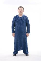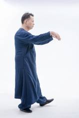 7.全身再度松沉一次,随着松沉往下的同时,双手顺势垂落。先交叉下落至丹田处,待双手指尖朝下后,手再向两旁卷开至两腿裤缝旁,掌心朝后。