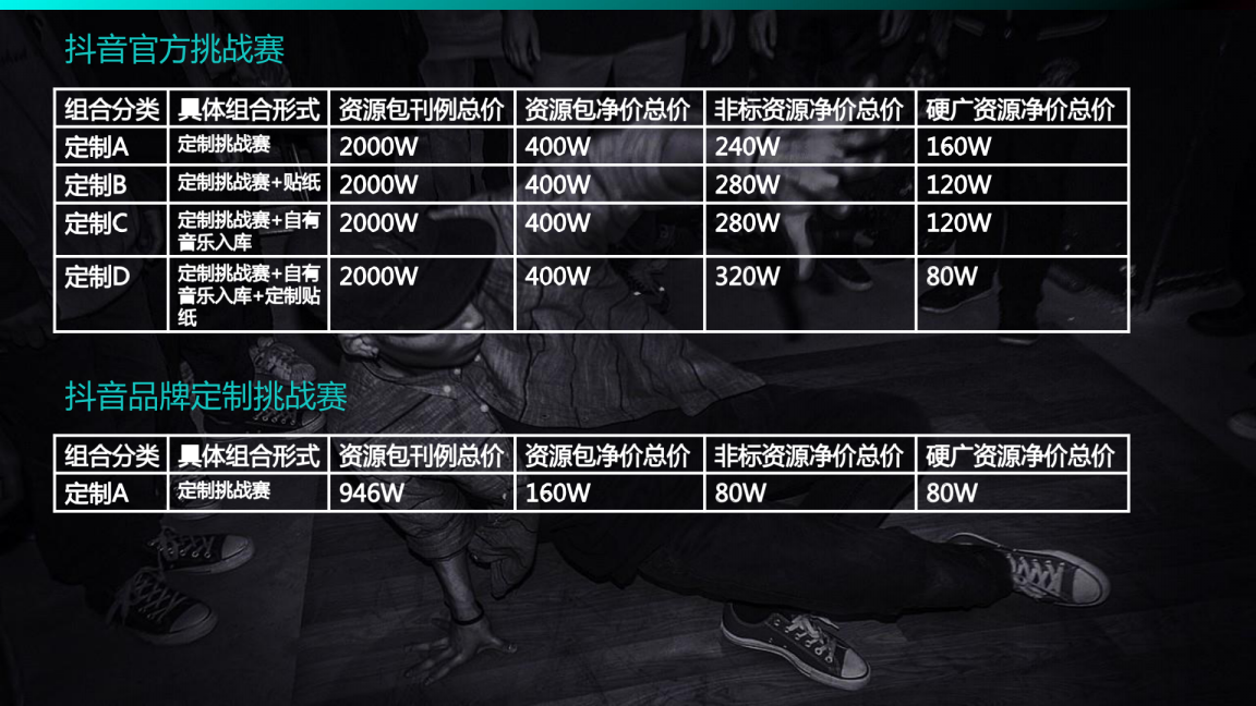 挑战赛相当于整合了抖音大量的广告资源、达人资源,同时私人定制权限等资源,最大化与用户进行互动,进而达到快速海量传播品牌的效果。当然,由于整合资源较多,费用也相对较高。具体合作模式及费用,企业可以和抖音各地分公司人员交流。部分报价请参考图8-13。
