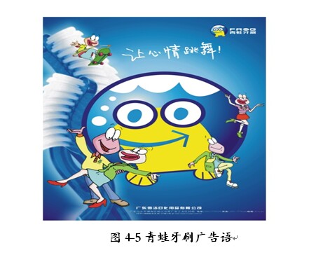 因为营销传播概念是基于传播、基于消费者的心理感受的,更强调一种意识形态里的感受,所以我们创意出用一个青蛙家族来整合所有产品的点子,青蛙家族由青蛙宝宝、青蛙妈妈、青蛙爸爸组成,每一位家族成员均有着自己鲜明的个性,有自己的生活圈及自己的生活故事。为了给消费者一个购买的理由(利益或价值),我们策划了青蛙们都喜欢的舞蹈,用跳舞来表达它们的生活情趣,在这一家中,快乐是主旋律,每天大家都过得非常有趣,玩得很开心,所以广告语我们就用“让心情跳舞”!给出青蛙的利益:青蛙保护你的牙齿,还给你带来欢乐,让你的心情好得就像跳舞一样。(如图4-5所示)。