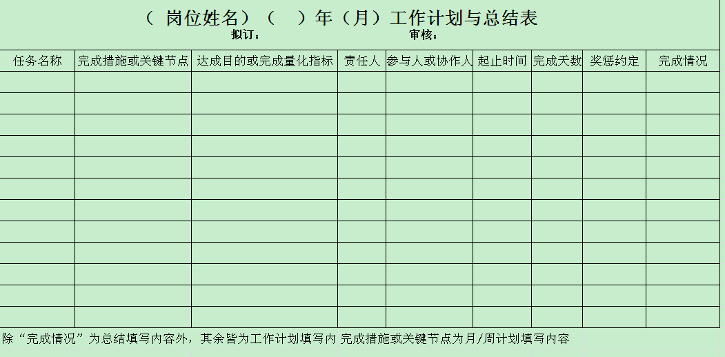 10. 工作总结与计划事项对等(在计划表中增加“完成情况”),凡计划事项必须在总结中体现完成情况,未完成事项必须分析说明原因,制定改善措施,并列入下一阶段工作计划。