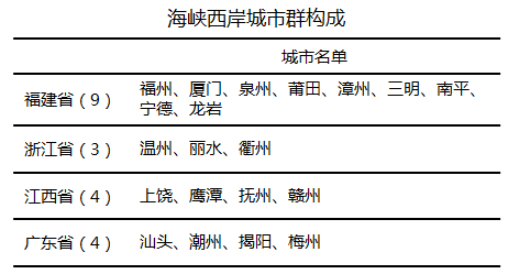 海峡西岸城市群是以福州、泉州、厦门、温州、汕头5大中心城市为核心,包含福建省的福州、厦门、泉州、莆田、漳州、三明、南平、宁德、龙岩,浙江省的温州、丽水、衢州,江西省的上饶、鹰潭、抚州、赣州,广东省的汕头、潮州、揭阳、梅州共计20个地级市所组成的国家级城市群。2009年12月,建设部(现已更名为住房和城乡建设部)正式批复《海峡西岸城市群协调发展规划》。这是继京津冀城市群之后,国家批复的又一区域城市群协调发展规划。