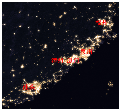 从卫星灯光图可以看出,海峡西岸城市群已逐步形成以福州、泉州、厦门为主要沿海分布的多中心结构的城市群。
