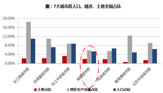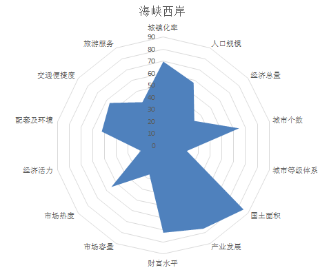 从城市群投资潜力雷达图可以看出,海峡西岸城市群国土面积、产业发展水平及财富水平较高,由于城市群无首位核心城市,城市等级体系结构较差,经济总量和经济活力较其他城市群还存在较大差距。