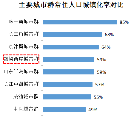 目前,海峡西岸城市群常住人口城镇化率为59%,高于我国常住人口城镇化率57.4%。海峡西岸城市群20个城市中城镇化率高于60%的城市有6个,城镇化水平仅次于京津冀城市群。