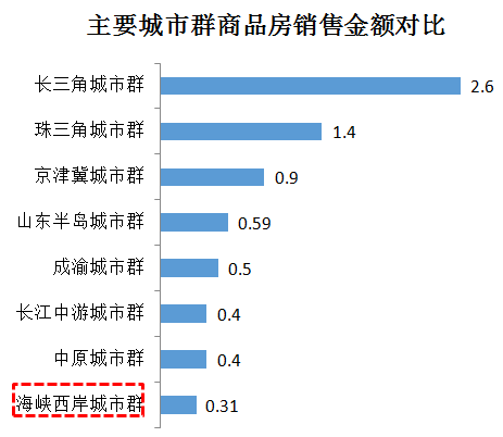 而从商品房销售金额对比来看,海峡西岸城市群与不仅与长三角、珠三角、京津冀城市群差距较大,仅占长三角12%,且与山东半岛、成渝城有一定差距。
