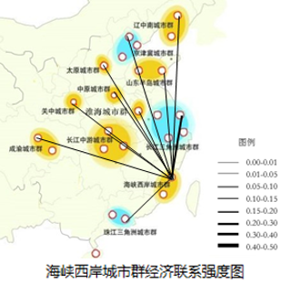 从城市群经济联系强度图可以看出,海峡西岸城市群和长三角城市群联系最为密切,其次珠三角及长江中游城市群联系较为密切。