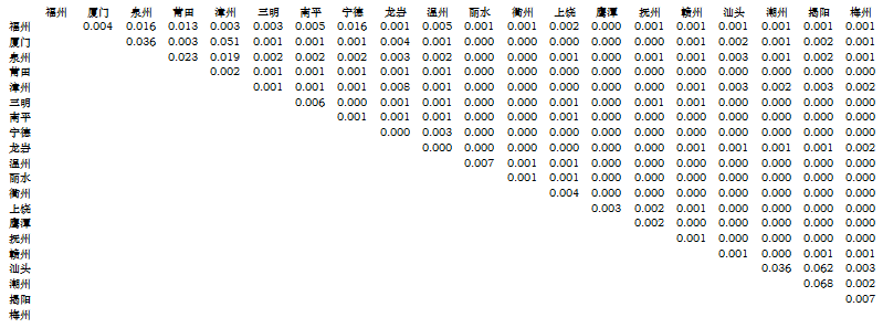 从海峡西岸城市群经济联系强度图可以看出,潮州和揭阳(0.068)、汕头和揭阳(0.062)、厦门和漳州(0.051)、厦门和泉州(0.036)、泉州和莆田(0.023)城市联系较为密切。