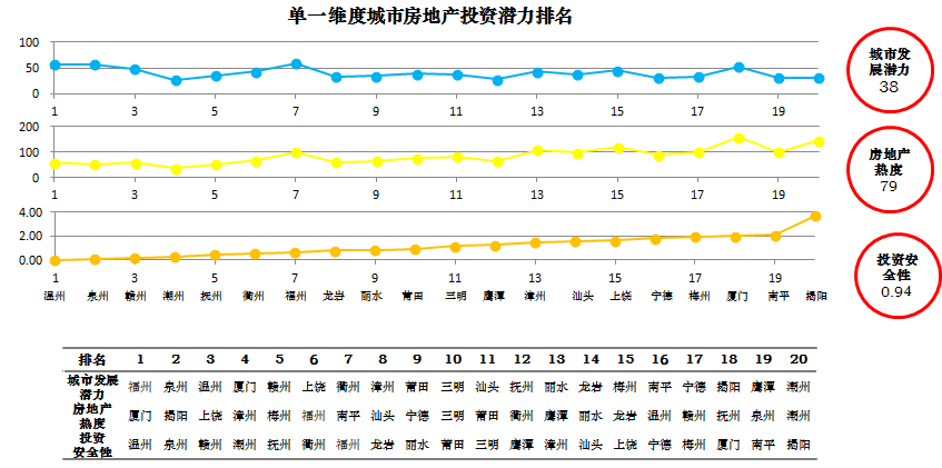 我们从城市发展潜力、房地产市场热度、投资安全性三个单一维度给出城市群各城市排名情况如下图:
