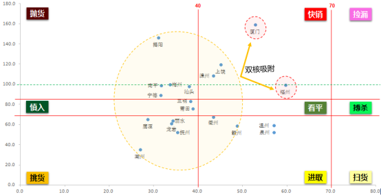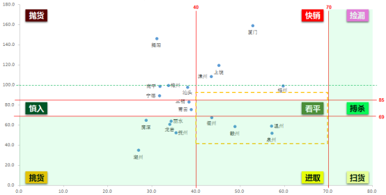 根据九宫格阶梯筛选法则,处在阶梯阴影区为重点拓展城市:黄线框内的重点拓展城市,主要包括泉州、温州、赣州、衢州。